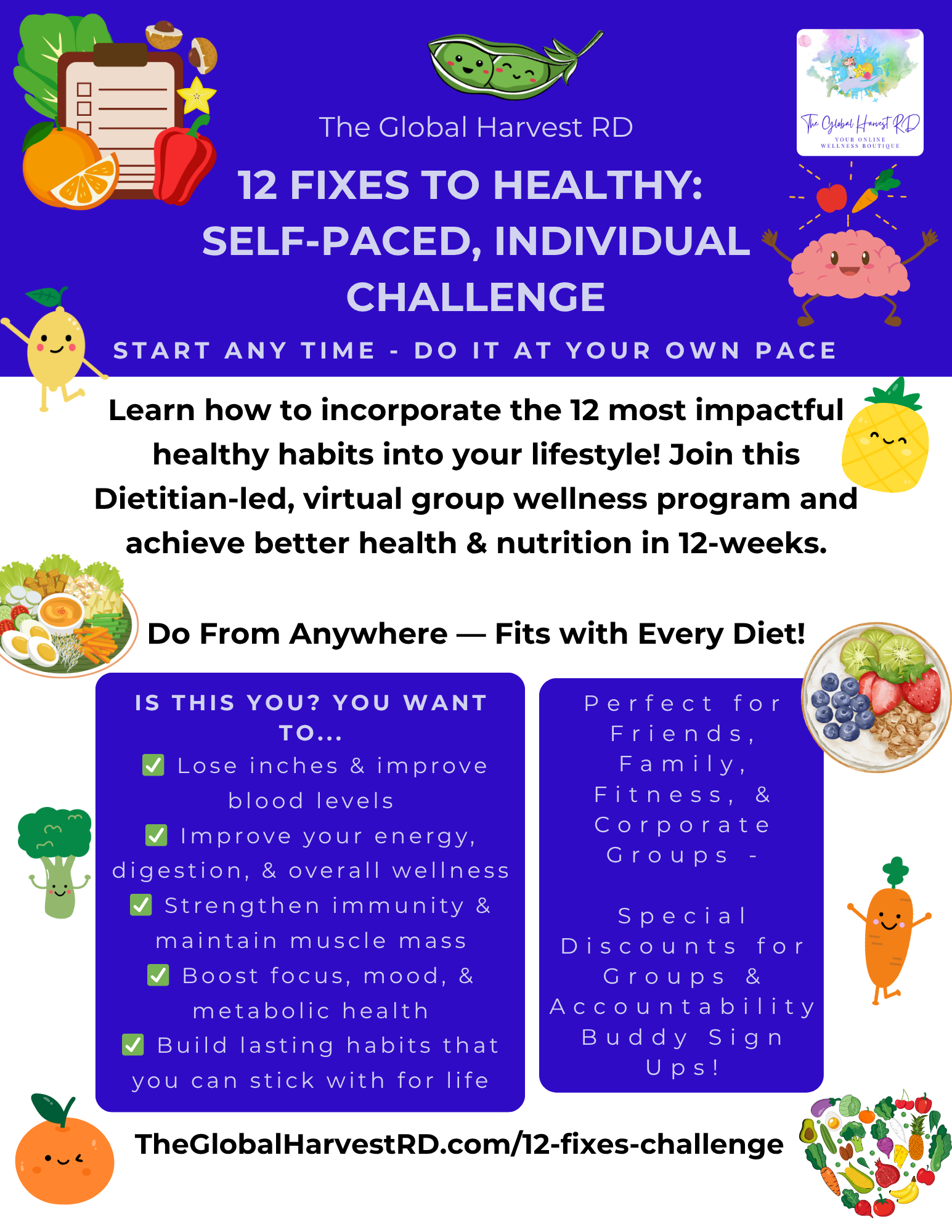 Sign up for the 12 Fixes to Healthy Challenge to learn how to integrate evidence-based healthy eating practices into your day-to-day routine! Participating with a group adds accountability, support, and fun as you adopt healthy habits together. For more information about the Program, visit our FAQs Page!
