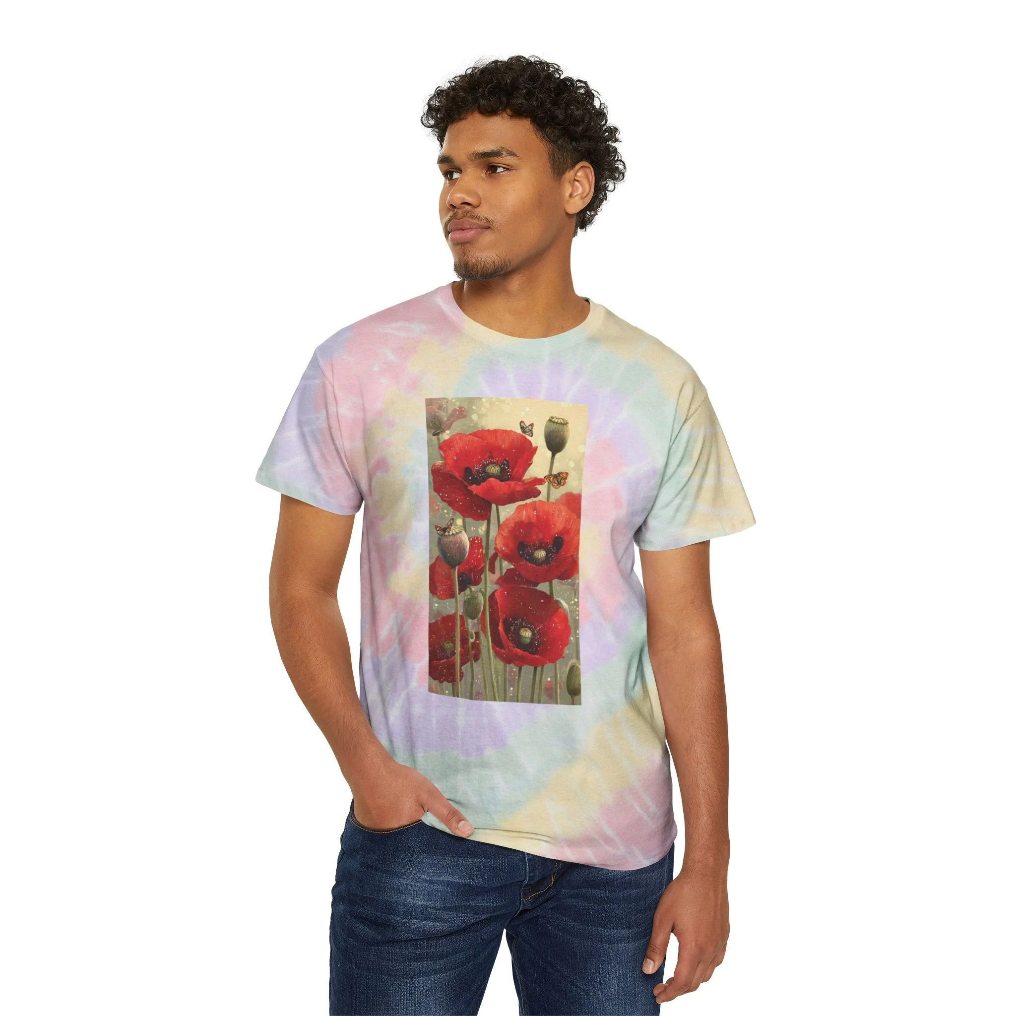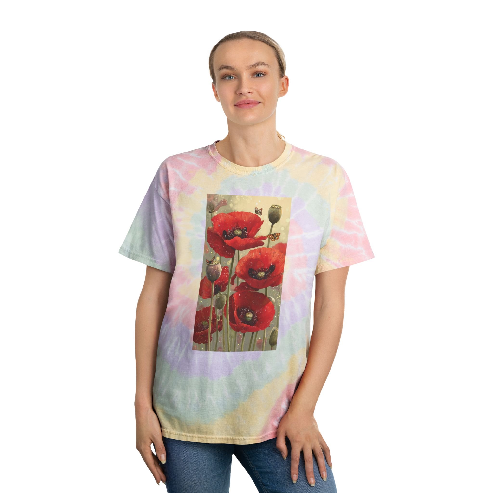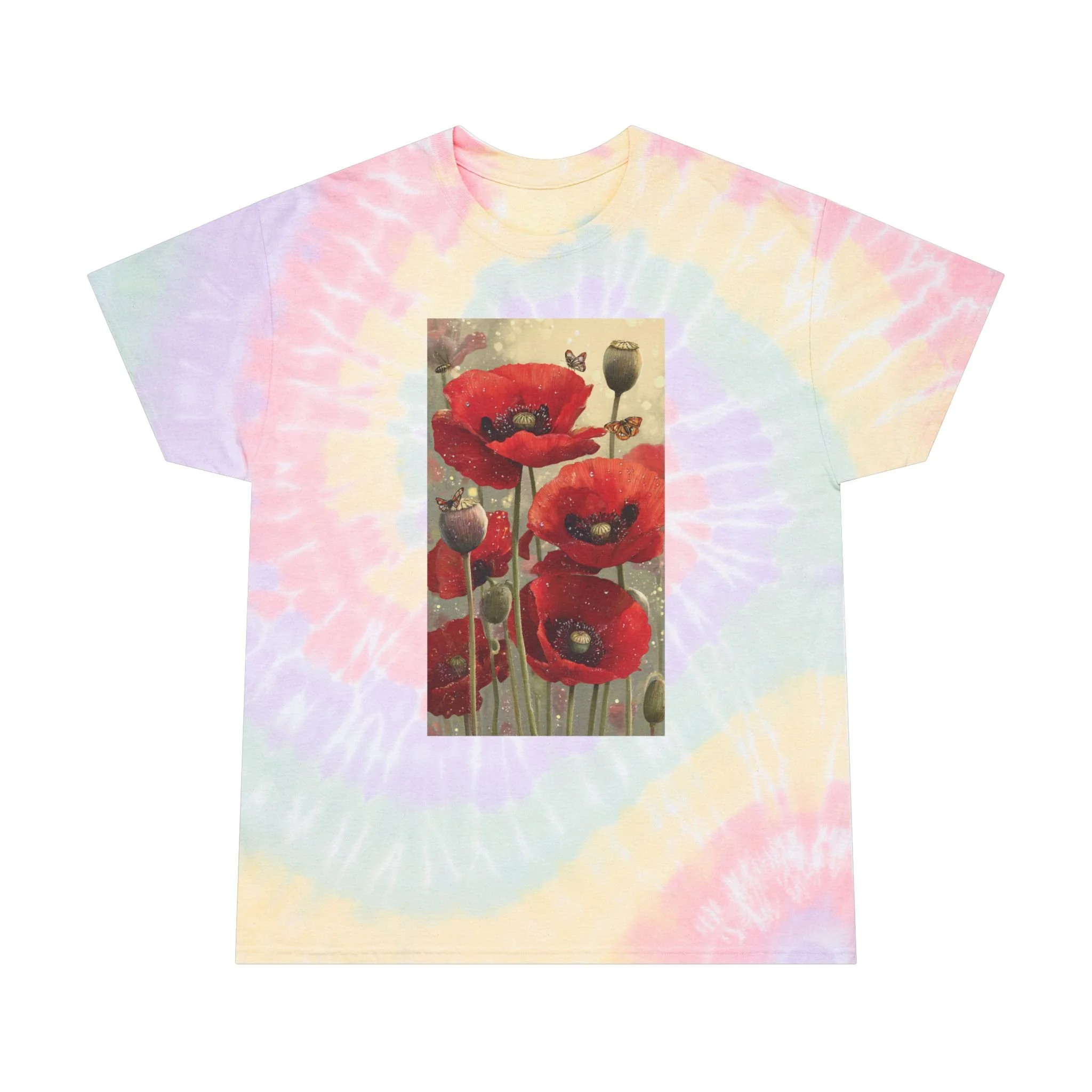 Pastel Spiral Tie-Dye Tee with Red Poppies — Floral Boho Graphic T-Shirt